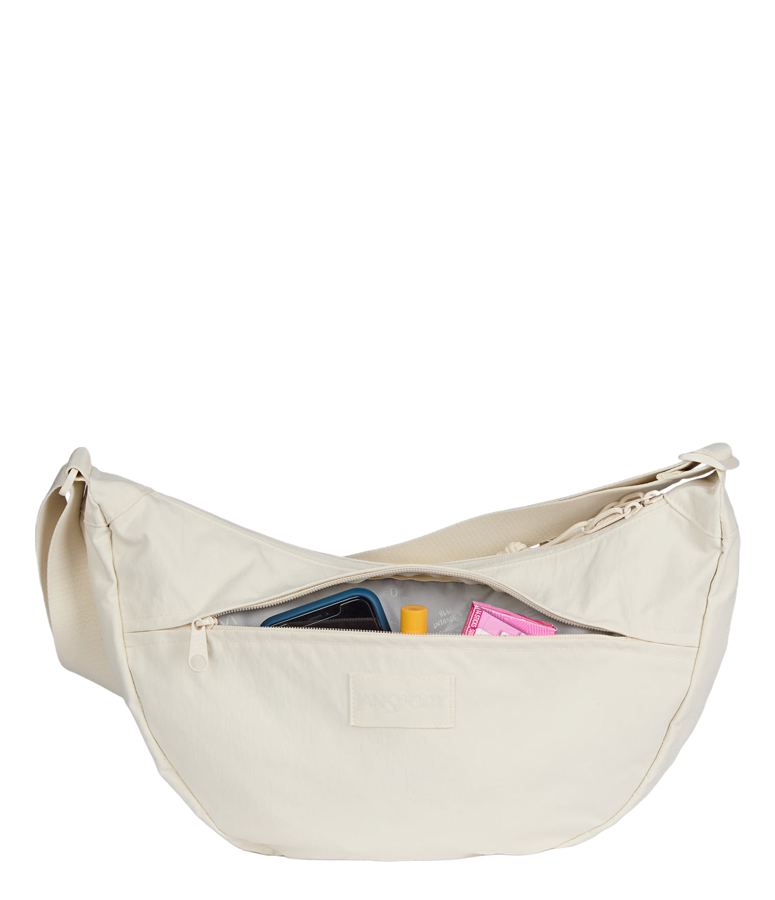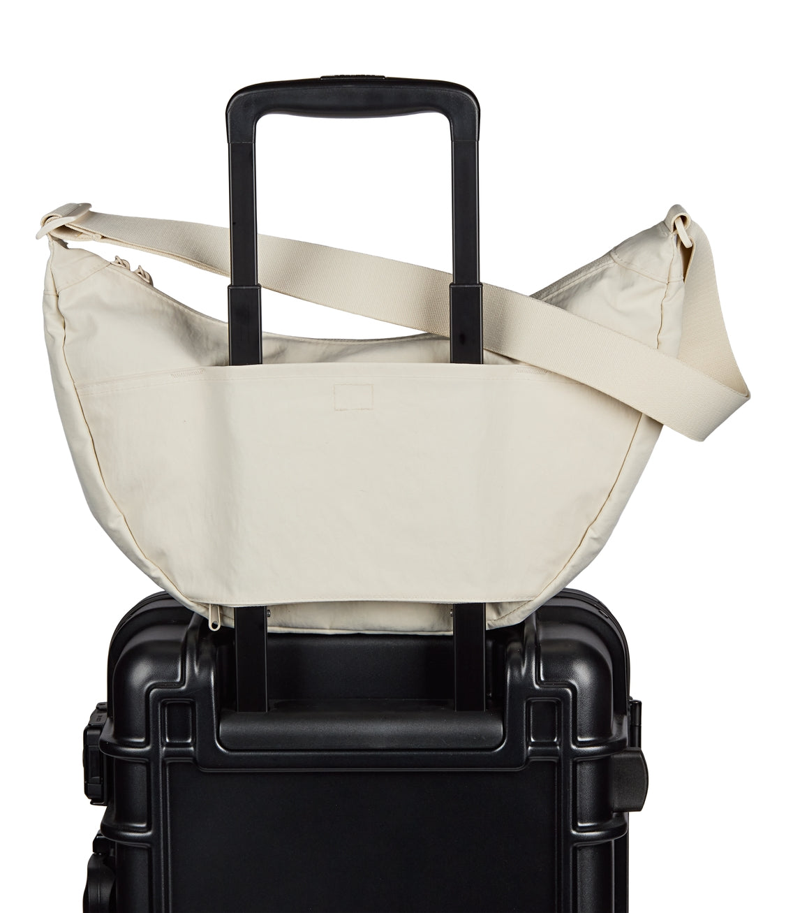 Soft and spacious for ease, movement, and everyday flow. The Unphased Crossbody Large features a slouchy silhouette made in part with 100% recycled crinkle nylon in a smooth, tonal color. Wear it crossbody or over your shoulder, or attach it to your suitcase with the trolley pass-through. Interior pockets and a roomy main compartment hold your backup layer, headphones, and whatever helps you move through the day with calm.